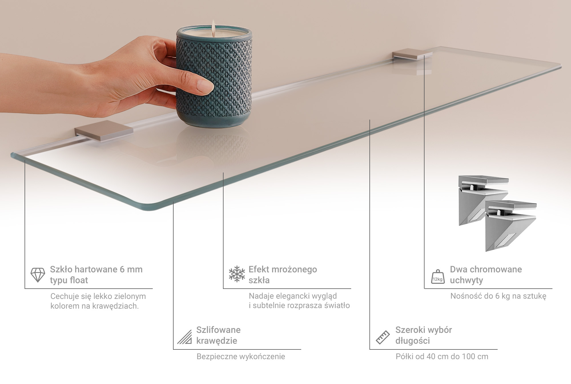 O: Szklana półka półprzezroczysta jest przeznaczona do montażu jako półka wisząca i wykorzystuje system montażu z dwoma uchwytami. Każdy uchwyt ma nośność do 6 kg, a maksymalna dopuszczalna masa umieszczona na półce wynosi 12 kg. Montaż jest prosty — należy zastosować dwa uchwyty w zalecanych miejscach, pamiętając o łącznym nieprzekraczaniu podanego obciążenia.