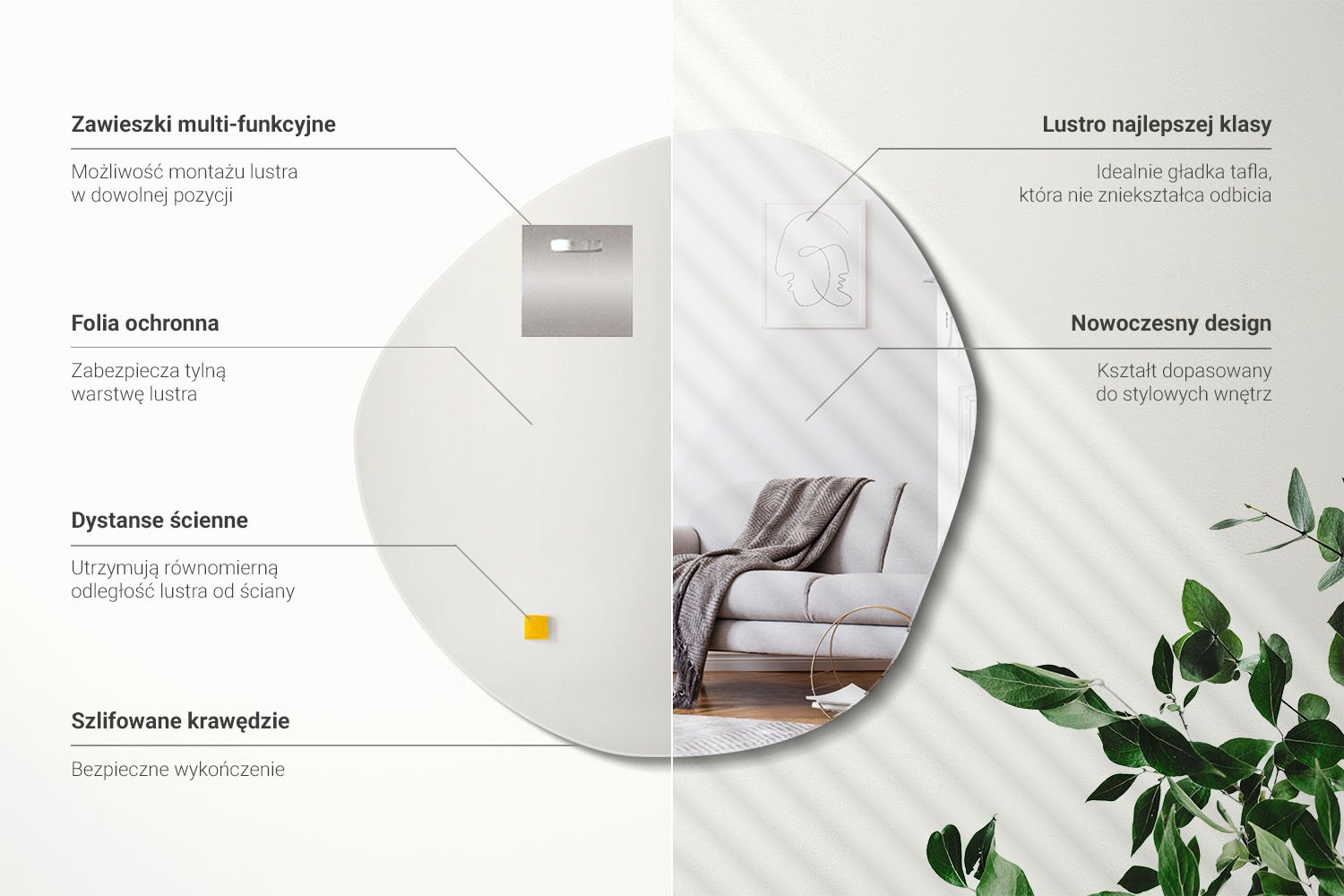 Nasze lustro podkreśli indywidualny charakter i styl Twojego wnętrza. Możesz użyć go jako funkcjonalnego lustra, a także sprawdzi się jako fantastyczny dodatek w każdym pokoju. Lustro nieregularne ścienne wiszące wykonane jest z najwyższej jakości materiałów dzięki czemu posłuży Ci przez wiele lat.