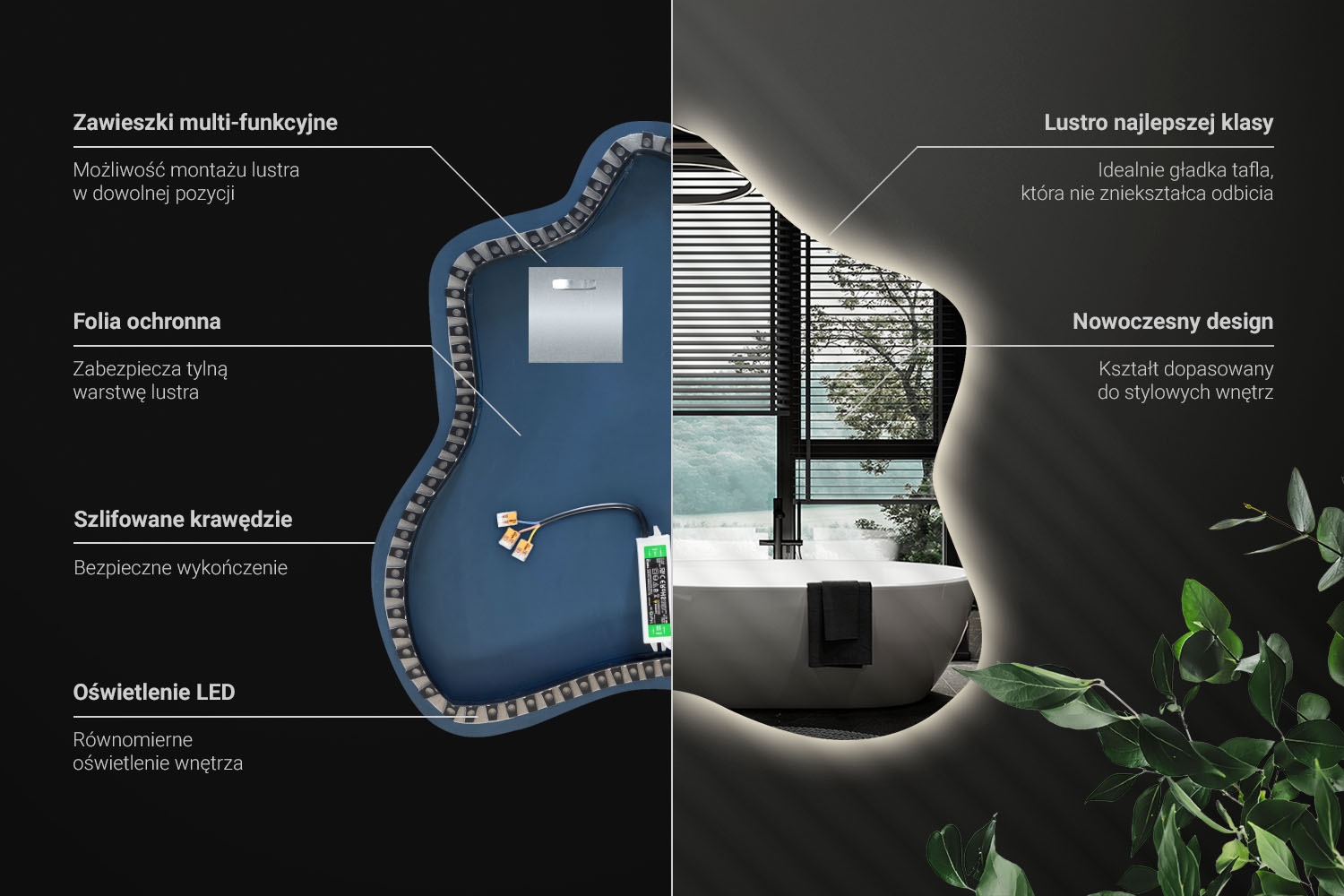 Dostępne w różnych rozmiarach, idealnie wpasuje się w salon, sypialnię, łazienkę czy przedpokój. Dzięki bezramowej konstrukcji prezentuje się nowocześnie i lekko, a montaż ułatwiają solidne metalowe zawieszki oraz piankowe dystanse. To lustro nieregularne z podświetleniem LED to doskonałe połączenie funkcjonalności i dekoracyjnego efektu – podkreśli Twój styl i sprawi, że każde pomieszczenie nabierze niepowtarzalnego charakteru.