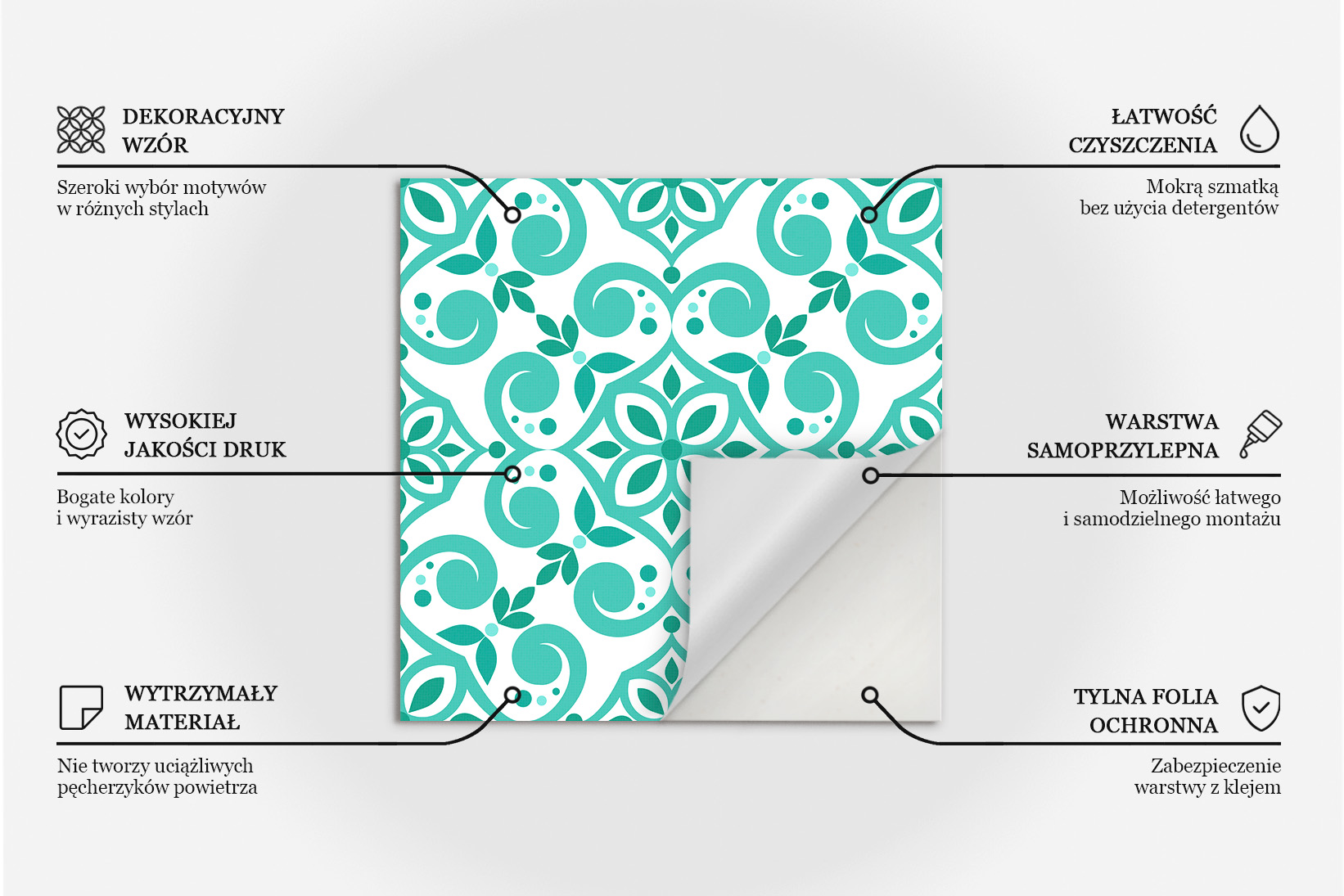- Pamiętaj, że kupujesz naklejki na kafelki z nadrukiem. Motywy takie jak np. brokat, złoto, srebro, beton, marmur, zardzewiała blacha itp. są jedynie nadrukowane, dlatego mogą różnić się wyglądem od swoich rzeczywistych odpowiedników.