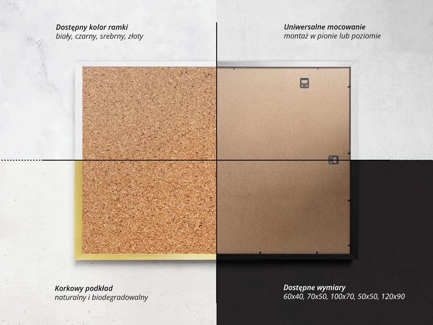 Tablica korkowa ozdobna biała ramka 70x50 to doskonałe rozwiązanie do organizacji przestrzeni zarówno w domu, jak i w biurze. Wykonana z wysokiej jakości korka, umożliwia wygodne przypinanie notatek, zdjęć, czy ważnych dokumentów. Dzięki możliwości zawieszenia w pionie i poziomie idealnie dopasuje się do Twoich potrzeb – w biurze, kuchni, czy pokoju dziecięcym. To narzędzie, które pozwala nie tylko na praktyczne przechowywanie informacji, ale także na personalizację wnętrza, tworząc miejsce na inspiracje czy pamiątki. Tablica korkowa o rozmiarze 70x50 wyposażona jest w elegancką białą ramkę, co dodaje jej ozdobnego akcentu i sprawia, że będzie stylowym elementem dekoracyjnym w każdym pomieszczeniu. Zestaw zawiera także komplet drewnianych pinezek, dzięki którym od razu możesz zacząć korzystać z tablicy.